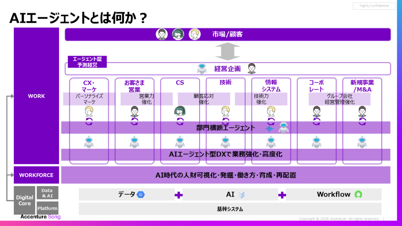 大きく変化するのが、最上レイヤーである「WORK」層だ。WORKとは仕事のレイヤーで、一般に組織の縦割り構造に基づいて社員が配置されている。これらの部門それぞれに専門性を備えたエージェンティックAIが存在し、さらに部門横断で情報連携をスムースにする「部門横断エージェント」が置かれる。