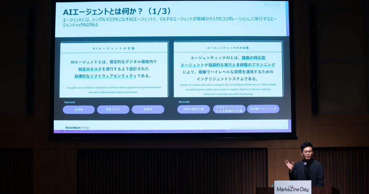 MarkeZine Day 2025 Autumnに登壇したアクセンチュアの横井博行氏は「AIエージェントがもたらすデジタルマーケティングの未来」をテーマに講演。冒頭で「今日、生成AIやAIエージェントが急激に進化しています。そうした中、多くの企業はこれらのテクノロジーをどのようにビジネスに適用すべきか、働き方はどう変わるのかと迷っています」と語り、AIエージェントがもたらす影響とマーケターの新しい働き方に関する最新動向をセッションで解説した。