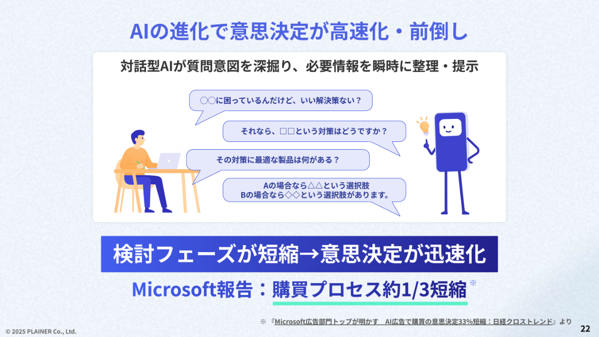 顧客がAIを活用して情報収集や比較検討を行うようになると、意思決定が迅速化する。それは、マーケターが顧客に影響を与えられる時間が短くなるということでもある。従来通りのリードナーチャリングをしていては、その間に顧客は別のサービスを選んでしまうかもしれない。
