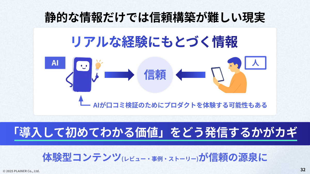 実際に、AIは既にテキストだけではなく画像や動画、ユーザーが操作できる対話型のコンテンツといったリッチな情報源を評価し始めており、2〜3年もすれば、AIが自らコンテンツを体験して総合的に判断するようになると考えられている。