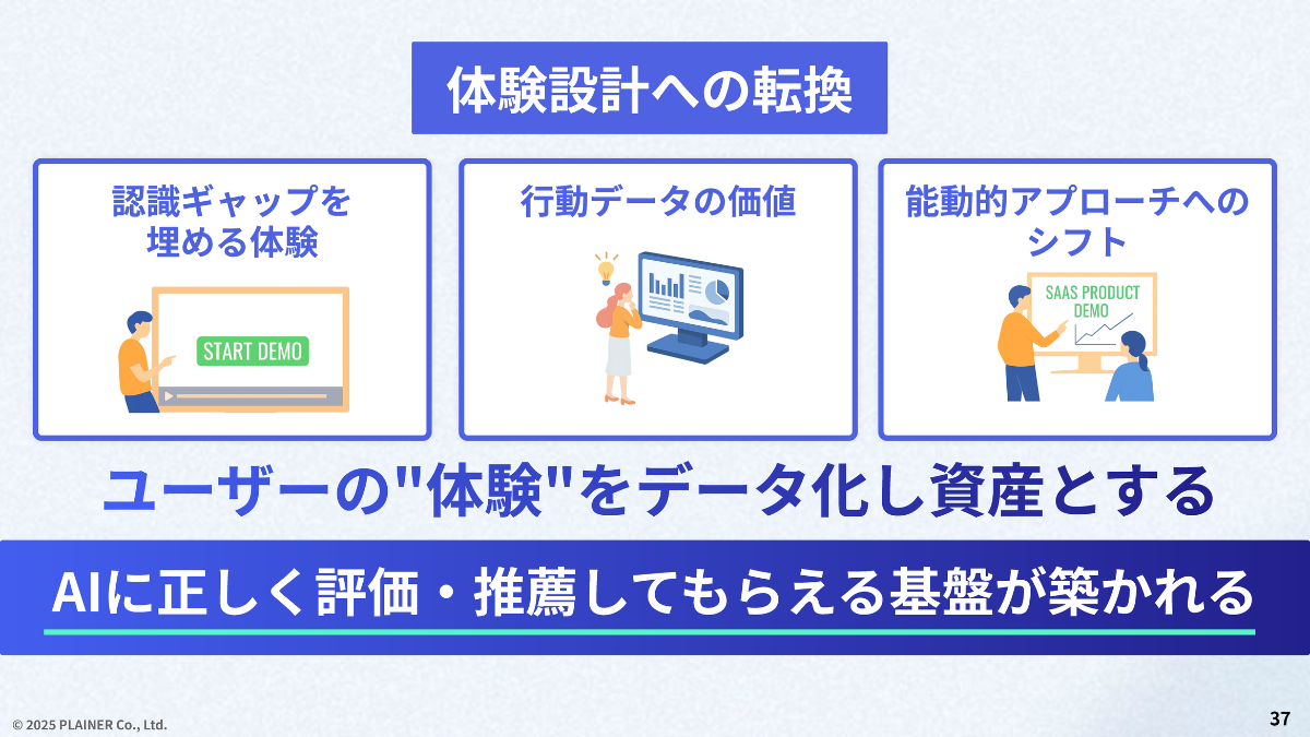 「今すぐ取り組むべきは、体験設計」と小林氏は指摘する。顧客との認識ギャップは、デモなどの体験で埋めることができ、それらを顧客が実際に体験することでAIが評価可能な「顧客の行動データ」という価値も生まれる。
