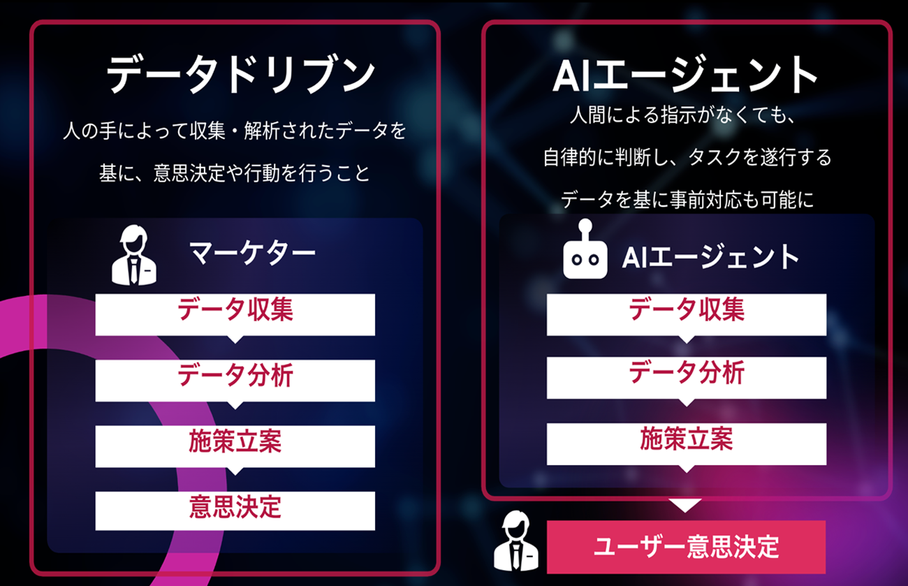 ここで、「データドリブン型マーケティング」と「AIエージェント型マーケティング」の違いについて座間氏は説明した。