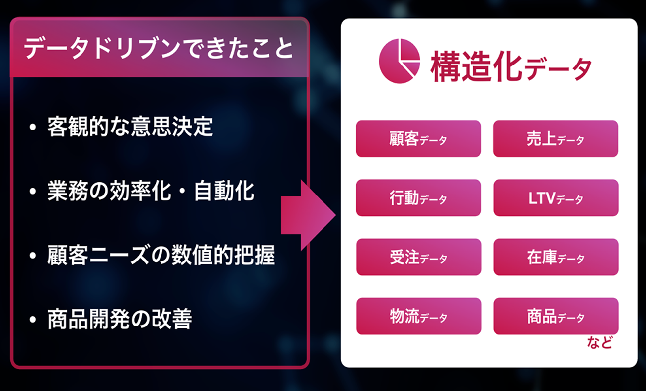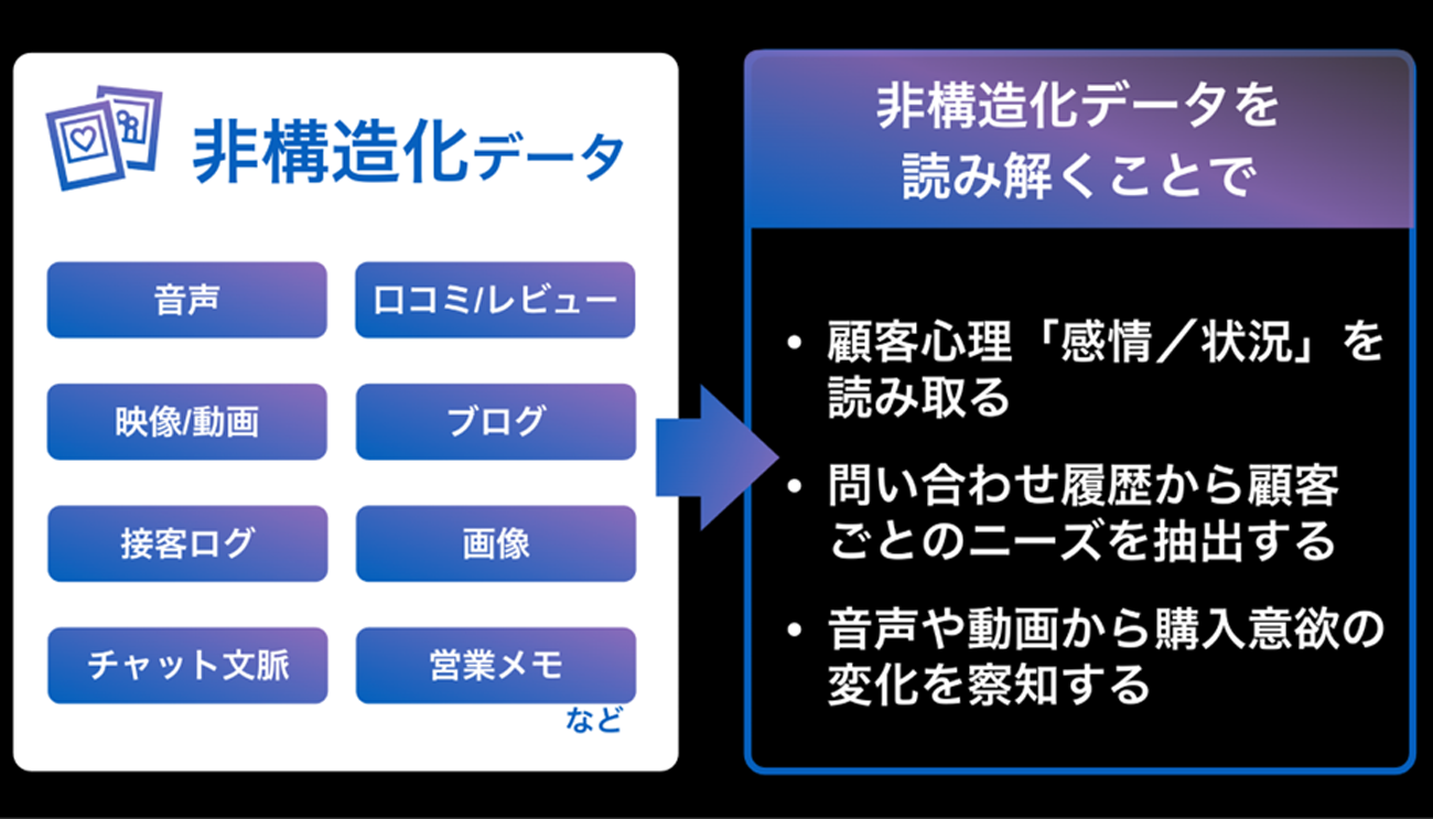 これまでのデータドリブン型マーケティングでは、購買データや行動データといった「構造化データ」を分析して、客観的な意思決定や業務効率化を進めていた。要は、構造化データから顧客ニーズを定量的に把握し、商品開発や施策改善に活かすことが一般的だったわけだ。
