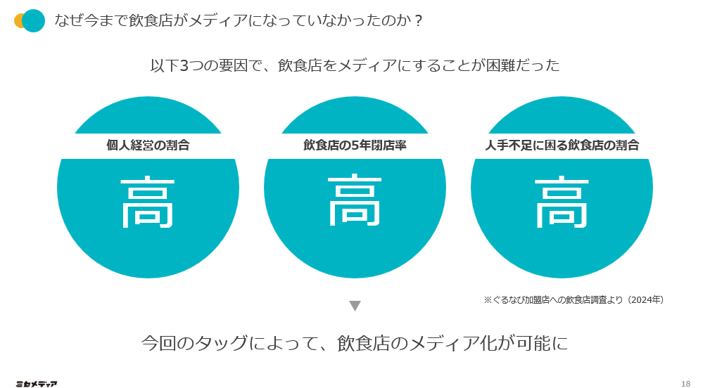 2つ目は、閉店率が高いこと。一般的に、飲食店の7割以上は5年以内に閉店すると言われている。つまり、広告用にサイネージを設置したとしても、投資資金を回収する前に店舗がなくなってしまうリスクが高い。そのため、安定したメディアとして成立しにくい側面があった。