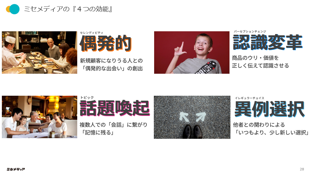 単なる映像放映や試食にとどまらず、来店客の体験を通じて行動変容を引き起こすことができる「ミセメディア」。その効能は、「偶発的」「認識変革」「話題喚起」「異例選択」の4つに分類できる。