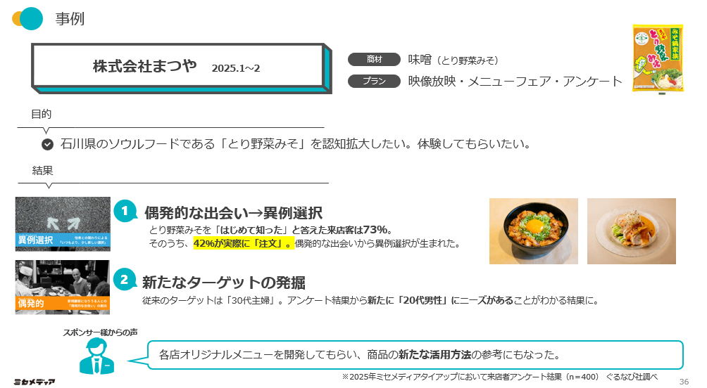 まず、石川県のソウルフード「とり野菜みそ」を展開する株式会社まつやの事例だ。県外への認知拡大を目的に「ミセメディア」を導入した。結果、来店客の73%が「はじめて知った」と回答し、そのうち42%が実際にタイアップメニューを注文。偶発的な出会いで新しい選択を促すことができた。またアンケートの結果、従来のメインターゲットである30~40代の主婦以外に、「20代男性」からも高い関心を集めていることが判明。新たなマーケティングのヒントも提供したかたちとなった。