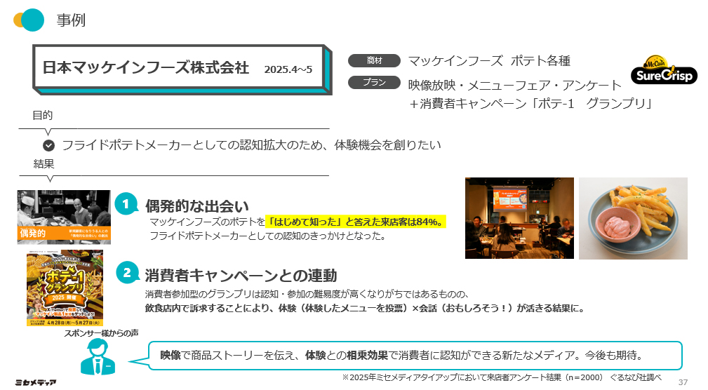 続いて紹介した事例は、フライドポテトメーカーの日本マッケインフーズ株式会社。こちらも来店客の84%がブランドを「はじめて知った」と答え、認知拡大のきっかけとなっている。さらに、消費者参加型キャンペーンと連動させることで、試食体験から会話、投票参加へと行動を促すことに成功した。