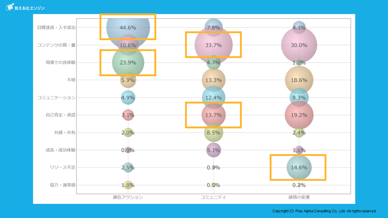 そして、この熱量を先ほどの3カテゴリー(「顕在アクション」「コミュニティ」「感情の変遷」)に掛け合わせることで、以下の通り熱量のマトリクスが作成できた。