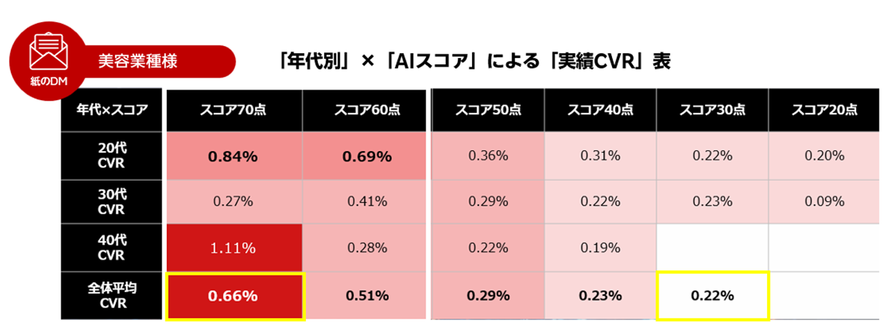 また、ある美容系企業ではAIが出したスコアごとに実際のCVRを計測しました。すると、スコア70点のリストのほうが30点のリストより、CVRが3倍も高い結果に。AIによるスコアリングの精度が証明される実績となりました。