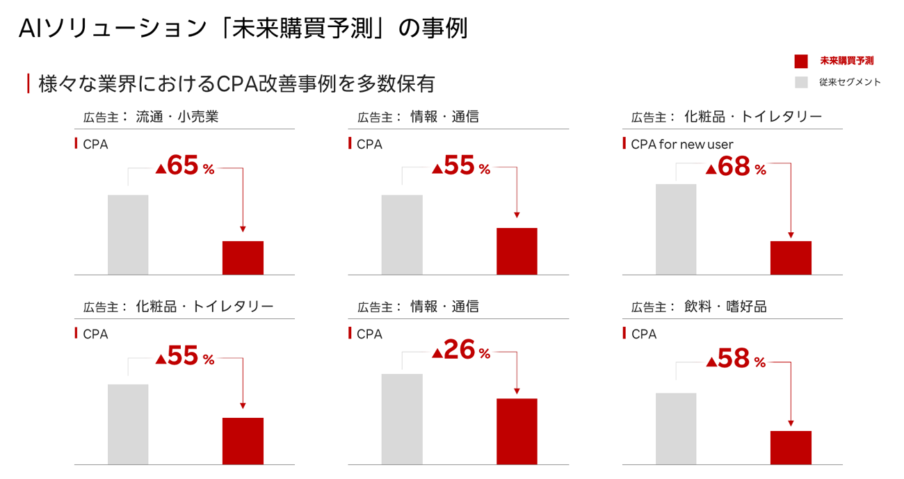 田中:小売、通信、化粧品、飲料など幅広い分野でCPA改善効果を発揮しています。「未来購買予測」によって68%ものCPA削減に成功した事例もあります。