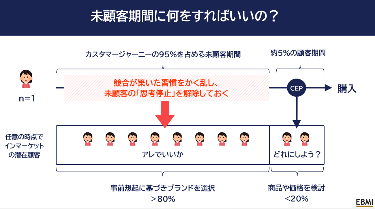 こうした研究を背景に芹澤氏は「短期成果を最大化したい場合でも、結局は認知や想起といった長期的なブランド構築に投資するしかない」と指摘する。それによって消費者のブランド選択、つまり将来のキャッシュフローの大半が決まってしまうからだ。