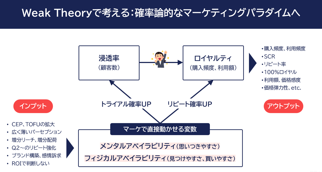 上記の前提に立つと、マーケティングで「直接動かせる変数」と「間接的にしか動かせない変数」が整理できてくる。また、Weak Theoryは消費財のような低関与カテゴリにおいても幅広い適用可能性を持つことがわかっており、近年よく見聞きする「カテゴリーエントリーポイント(CEP)」もこのWeak Theoryを実用化したものだ。