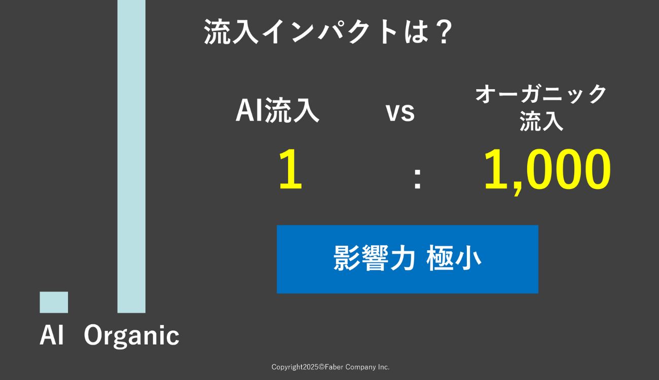 実際、AI流入を1とした場合、オーガニック(SEO)流入は1,000。AI流入はSEO流入と対比すると0.1%しかない。まだまだSEO流入のための施策が必要な時代は続くだろう。