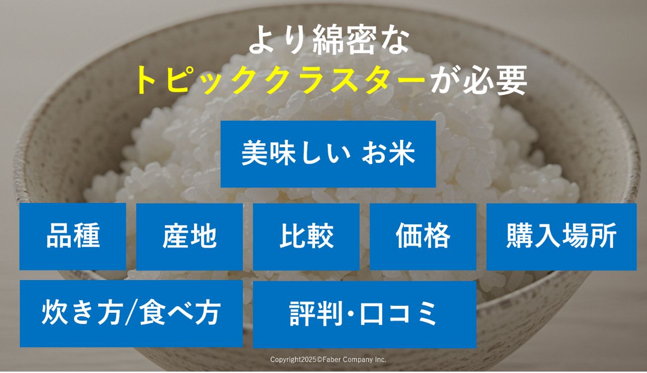 「メインとなる検索キーワードに対し、どんなことが気になるのか、あらゆる面から洗い出してコンテンツを用意していく。品種、産地、食べ方、比較、価格、口コミ、購入場所……『美味しい お米』に紐づくトピックだけでもたくさん考えられますよね。こうしたメイントピックに関連したコンテンツをより充実させられるかどうかが、選ばれるブランドになるための重要なポイントの1つです」(月岡氏)