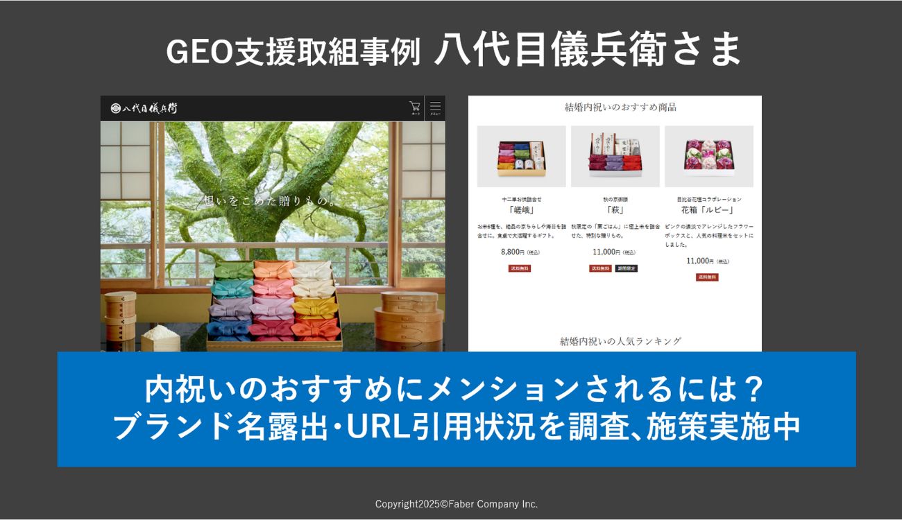 同社の購入者の大半は、ギフト需要である「結婚内祝い」「出産内祝い」「香典返し」といったタイミング。そのタイミングで今後AI検索を取り入れる生活者が増えていくとした時に、どれだけ自社が露出するか、選択肢に挙がるかを考えたいという相談からFaber CompanyとGEO施策に取り組んでいるという。