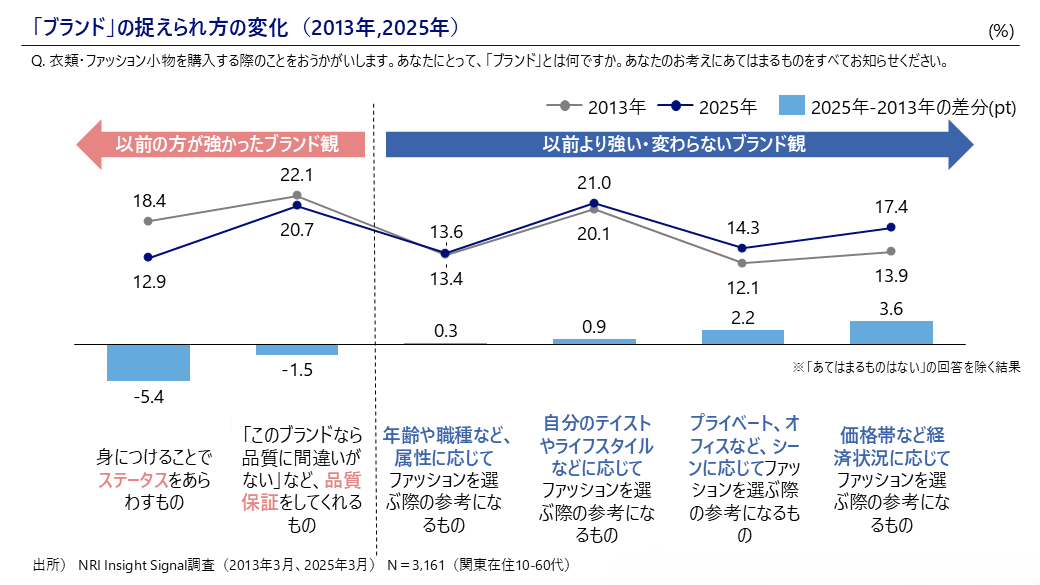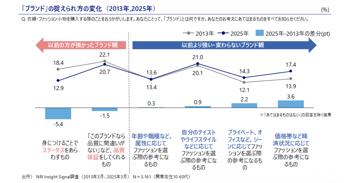 NRIが2013年と2025年に行った調査結果の比較(図1)を見ると、「身につけることでステータスをあらわすもの」「このブランドなら品質に間違いがない」といった回答は減少。一方で「ライフスタイルやテイスト」「利用シーン」「経済状況」に応じて選ぶ際の参考としての声が増加している。ブランドは「自分が納得するための基準」へと移行しているのだ。
