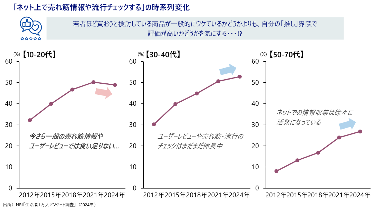 特に若年層では、ブランドそのものではなく、どのように比較・判断するかの基準が大きく変わってきている。かつて若年層は「売れ筋情報」や「ユーザーレビュー」を参考にしていたが、今ではそれだけでは不十分であり、一般的なレビューよりも「推し界隈で評価されているか」や「信頼できる専門家の発信」を選択基準にする傾向があることが、NRI「生活者1万人アンケート調査」からも明らかになっている。