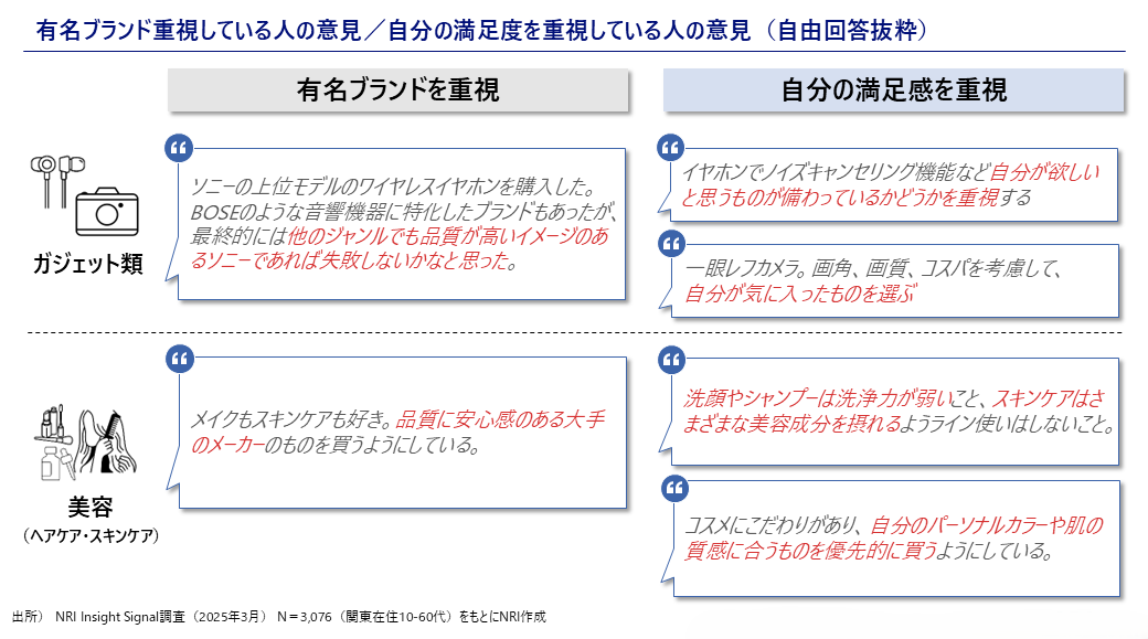 それぞれを重視している理由を見ると、両極の考え方が鮮明だ。同じカテゴリ内でも、「安心感」を求める層と「自分の満足感」を求める層で、判断基準の二極化が鮮明になっている。