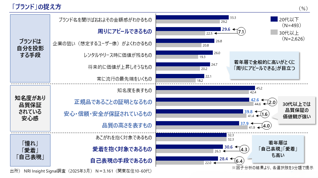 年代別の差異は大きい。30代以上では「ブランド=品質保証」という価値観が根強く残るが、若年層では「自己表現」「愛着」「周囲へのアピール手段」としてブランドを捉える傾向が強い。