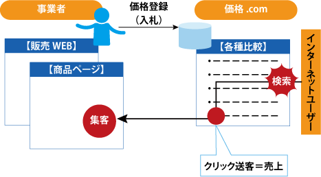 ちなみに、このモデルにおける事業者の対象は家電製品などを販売する店舗が多く、事業者は商品登録せずにカカクコム側が登録した商品マスターに対して価格登録(入札)する形式になっているのが特徴である(商品マスター自体は、価格.com側が人海戦術で登録しているとのことであり驚きの事実である!)。