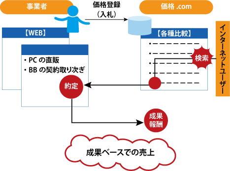 さて、2つ目の収益モデルはというと…ブロードバンド事業者やPC等を直販する事業者の商品を各社横断的にデータベース化し、その情報をユーザーが検索・選択して約定 ---例えば、ADSLの接続契約/直販PCの購入等--- に至った際の成果に基づく報酬がそれである。いわゆる、PPP(Pay Per Performance)モデルである。