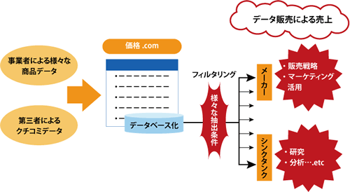 となっている。本事業は、まだはじまったばかりの事業だが、ユーザーによる膨大な量のクチコミが蓄積された価格.comのデータベースは、メーカー側からすれば、商品販売戦略を練る際の有用なマーケティングデータであり、シンクタンクからすれば、分析・研究の対象となり収益の源泉として成立しているのである。