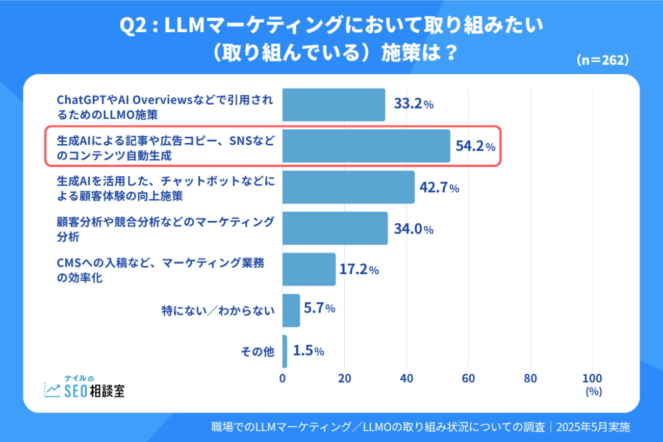 先日、ナイルで「職場でのLLMマーケティング/LLMOの取り組み状況についての調査」というアンケートを実施したところ、「LLMマーケティング(※)において取り組みたい(取り組んでいる)施策は?」の問いに対して、半数以上の人が「生成AIによる記事や広告コピー、SNSなどのコンテンツ生成」と回答していました。