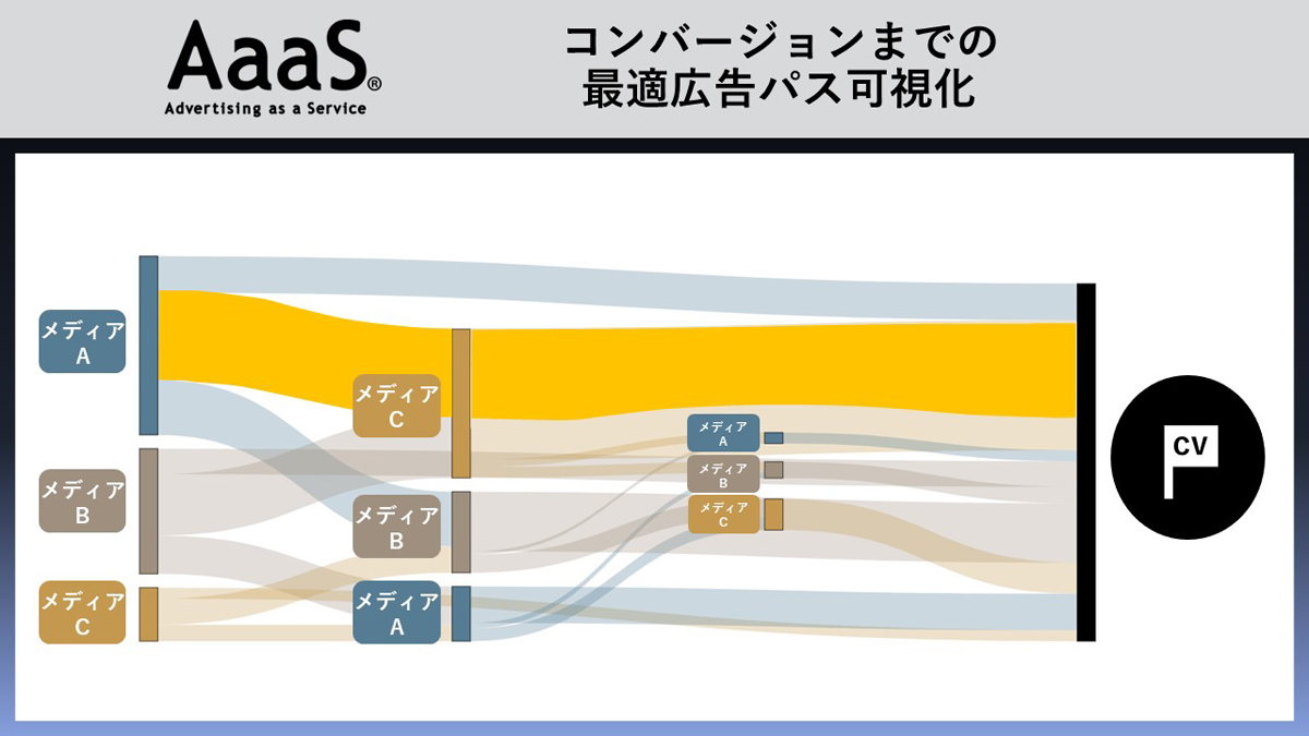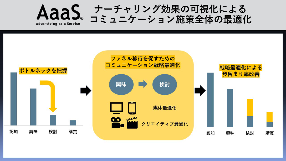 「AaaS with TTD」の第一弾機能では、テレビCMやデジタル広告への連続的な接触における顧客行動を可視化する。これにより、コンバージョンまでの最適な広告パターンを把握し、広告接触によるナーチャリング効果を定量的に分析できるようになる。