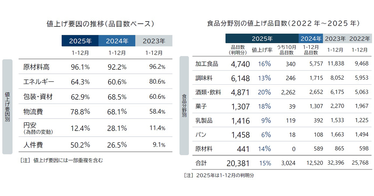 2025年通年では12月までの公表分で累計2万381品目が値上げ対象となり、前年実績(12,520品目)から62.8%増加・2年ぶりに2万品目を超えた。分野別では「調味料」の6,148品目が最多で、前年から大幅増となった。「酒類・飲料」も4,871品目で前年比8割超の増加となっている。値上げ率平均は15%で、前年の17%をやや下回った。