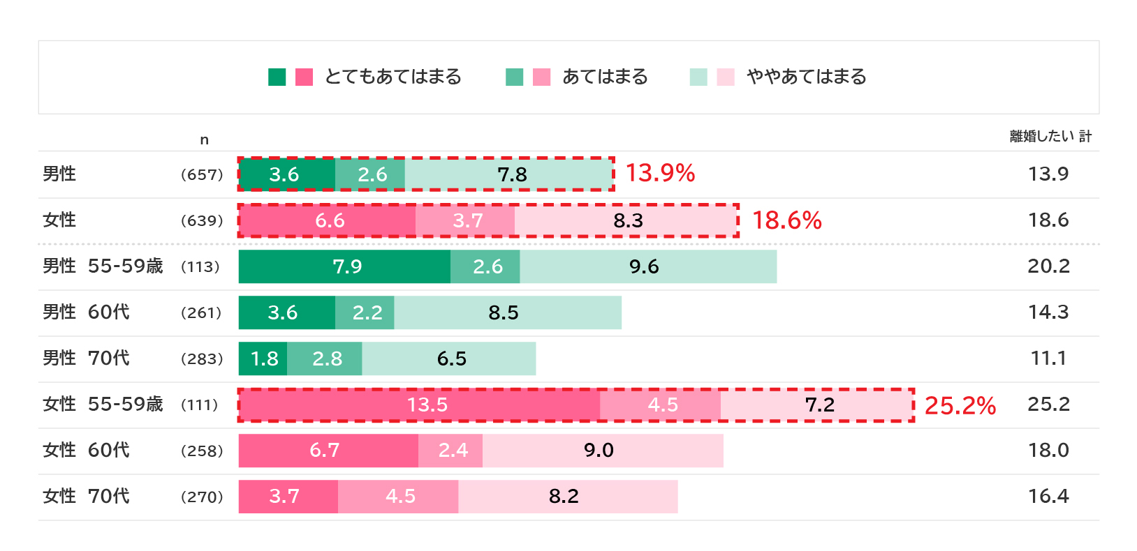「財産や子どものことなどを気にしなくて良いなら離婚したい」という回答は男性13.9%に対し、女性18.6%。特に55~59歳女性は25.2%と最も高かった。