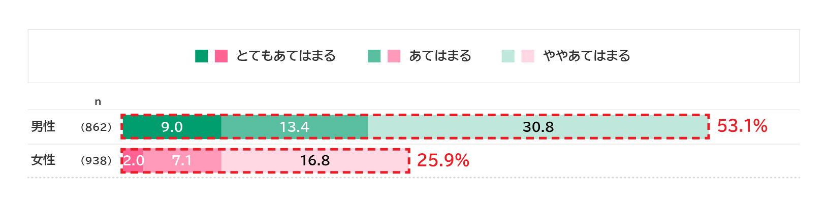 「モテたい」と考える男性は53.1%と半数を超え、女性は25.9%だった。一方、「一緒に遊んだりおしゃべりできる友人・知人がいる」と回答したのは男性47.6%、女性67.3%と、女性のほうが人とのつながりを重視する傾向が強い。