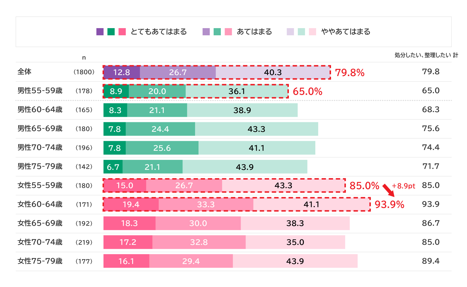 「今あるものを処分・整理したい」と答えたのは全体で79.8%。60~64歳女性では93.9%に達し、55~59歳女性(85.0%)と比べても整理意欲が高い。さらに「人生をもっと良くしたい」シニアは78.9%、「多少高くても自分の気に入るものを買いたい」も73.2%と、前向きな生活意識が見て取れる。