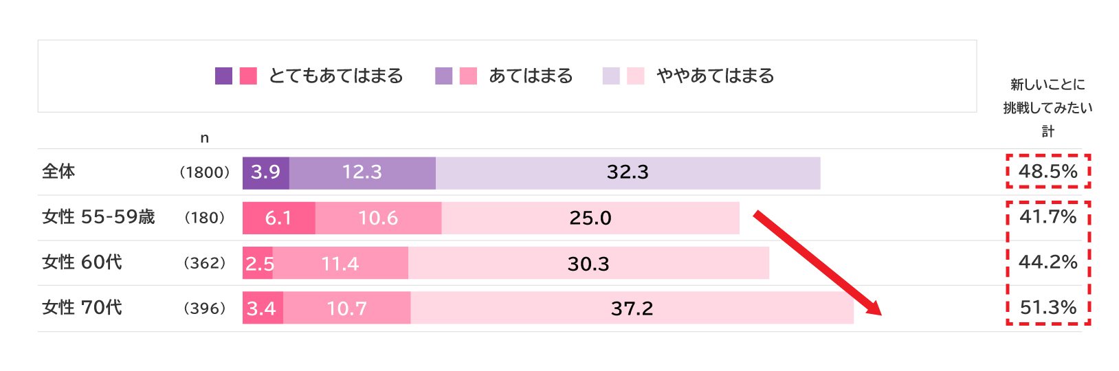 「新しいことに挑戦してみたい」は全体で48.5%。女性は年齢を重ねるほど割合が増え、70代で51.3%となった。また、自身の人生に「80~100点」と付けた人の割合は、55~59歳で23.6%、60代で32.8%、70代で39.2%と、年齢とともに上昇している。