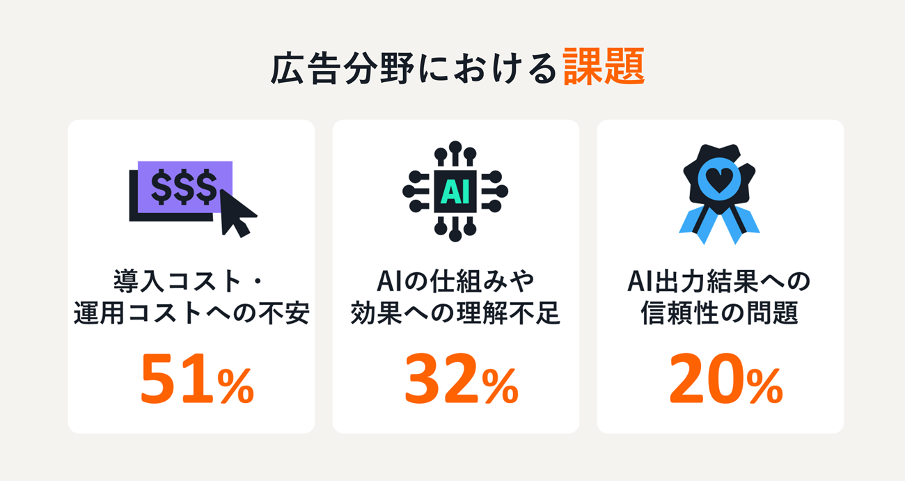 実用に向けた障壁として挙げられる課題は3つ。「導入コスト・運用コストへの不安」「AIの仕組みや効果への理解不足」「AI出力結果への信頼性の問題」だ。