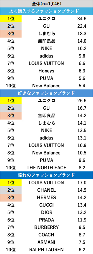 まず、「よく購入するファッションブランド」「好きなファッションブランド」「憧れのファッションブランド」を聴取。よく購入するファッションブランドでは「ユニクロ」が34.6%で全体トップとなり、「GU」が22.4%で続いた。