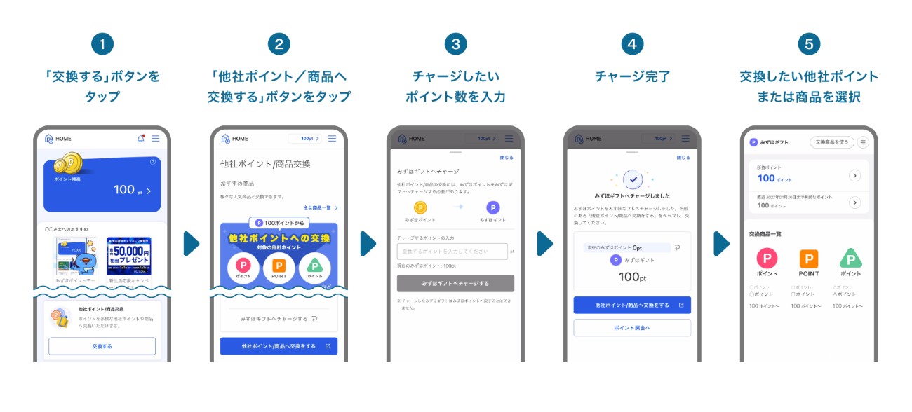 そこで、お客さまが「みずほポイント」を日常的にご利用いただける、汎用性の高い仕組みを目指しました。ライフスタイルに合わせて自由に共通ポイントを選び、制約を受けずに等価交換できるサービスは国内銀行初(※みずほ銀行調べ 2025年3月4日時点)となります。