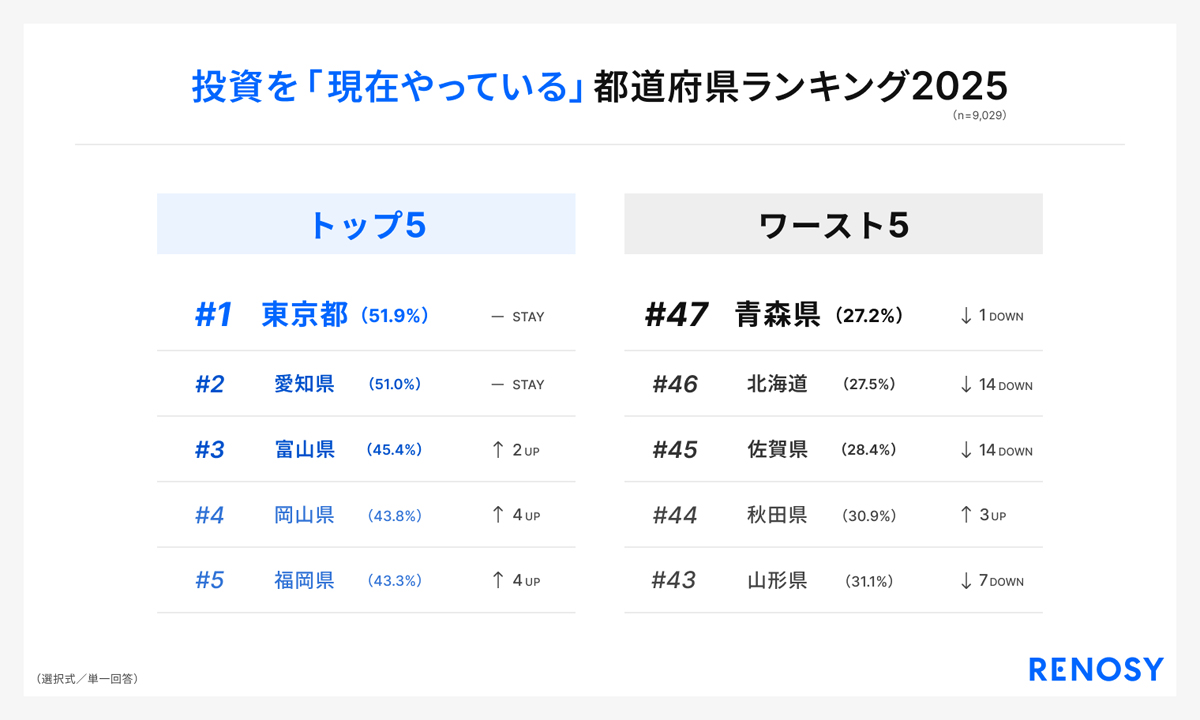 投資を「現在やっている」と回答した割合が、2024年に続いて東京都(51.9%)がトップとなり、2位は愛知県(51.0%)だった。富山県(45.4%)は前年より順位を2つ上げ、3位に入った。2024年の結果で46位だった青森県は27.2%で最下位となり、「資産はない」と回答した割合も47都道府県中で最も高い22.3%だった。これにより、地域によって資産形成への関心に差があることが示された。