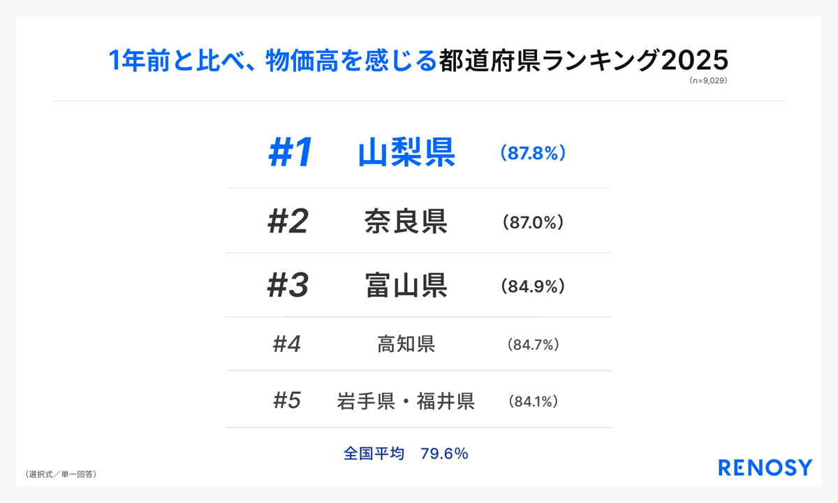「1年前と比べ、物価高を感じる」と答えた割合は山梨県(87.8%)が最も高く、奈良県(87.0%)、富山県(84.9%)が続いた。全国平均も79.6%と高く、全国的に物価高を感じていることがわかる。