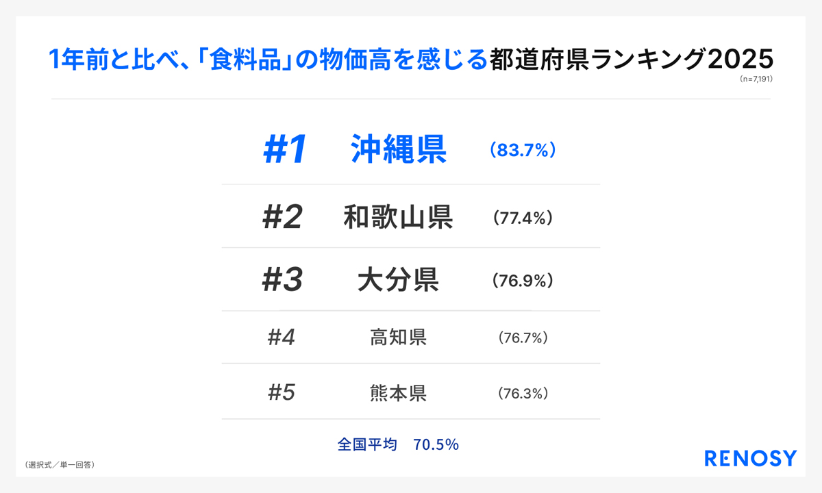 特に「食料品」の値上がりを感じた割合は沖縄県(83.7%)が最高で、和歌山県(77.4%)、大分県(76.9%)も上位となった。