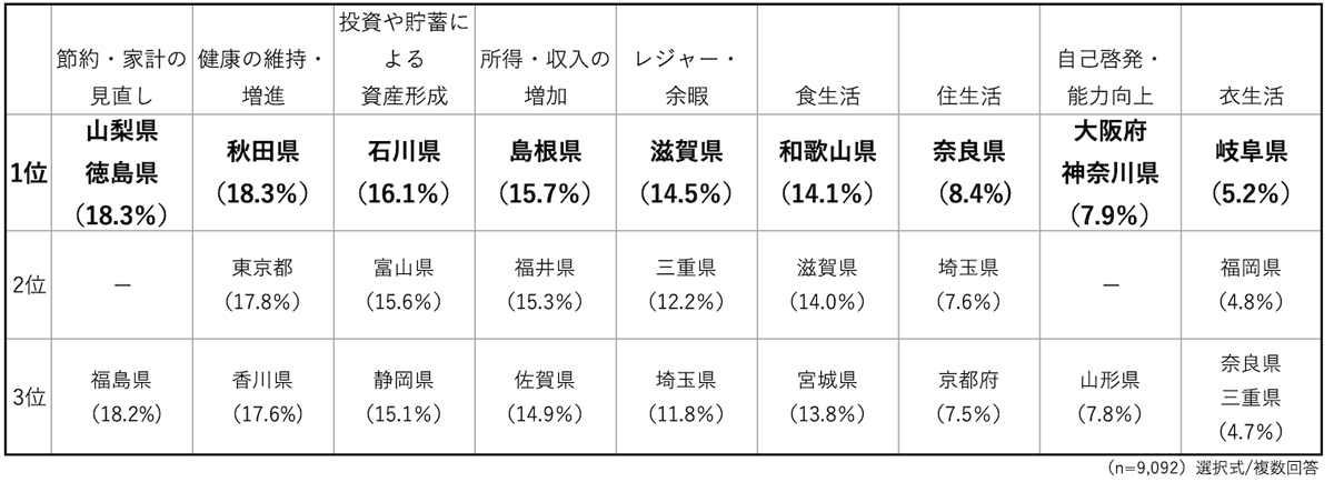 今後生活で注力したいこととして、「節約・家計の見直し」は山梨県と徳島県(共に18.3%)が同率で1位、3位は福島県(18.2%)だった。「投資や貯蓄による資産形成」は石川県(16.1%)、富山県(15.6%)、静岡県(15.1%)が上位だった。「所得・収入の増加」を重視するのは島根県(15.7%)、福井県(15.3%)、佐賀県(14.9%)だった。物価高を実感している地域ほど、節約や資産形成への意識が高い傾向が見られた。