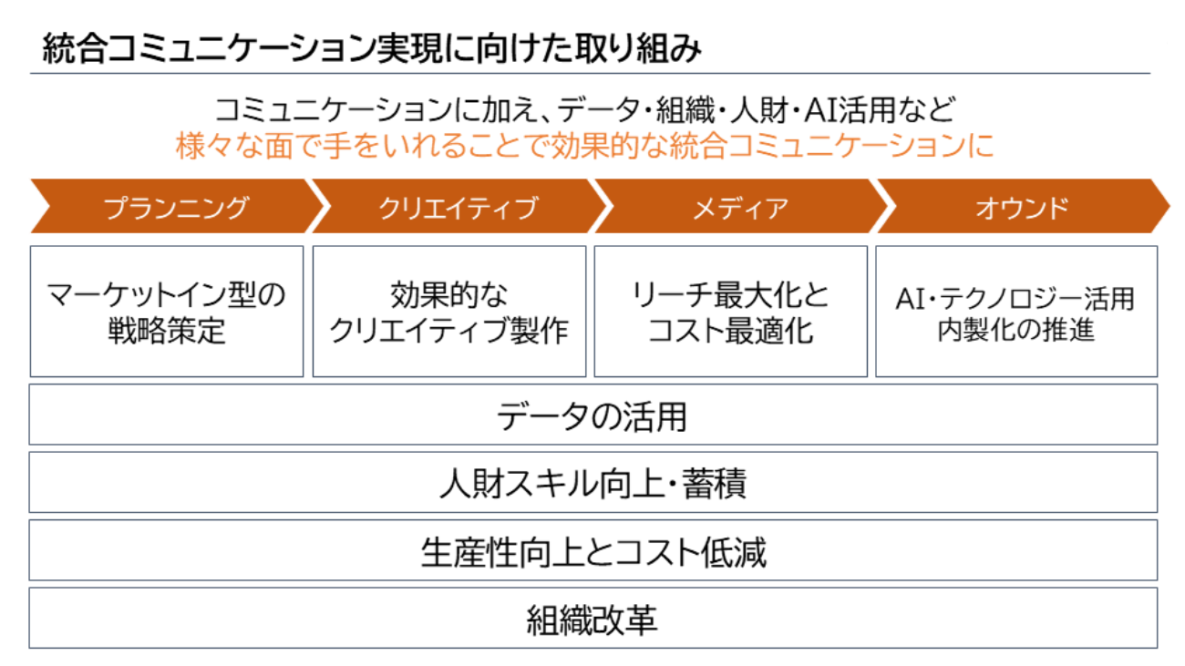 この基本方針のもとKDDIでは、統合コミュニケーションの実現に向けた活動に取り組んでいる。統合コミュニケーションとは、「顧客とのあらゆる接点で一貫性のあるブランド体験を提供し、ブランドへの興味喚起や好意獲得を実現してマーケティング施策の効果最大化を目指すこと」と馬場氏。その実現のため、同社はプランニング・クリエイティブ・メディア・データ分析・人材育成・組織改革など、幅広い領域で取り組んできた。