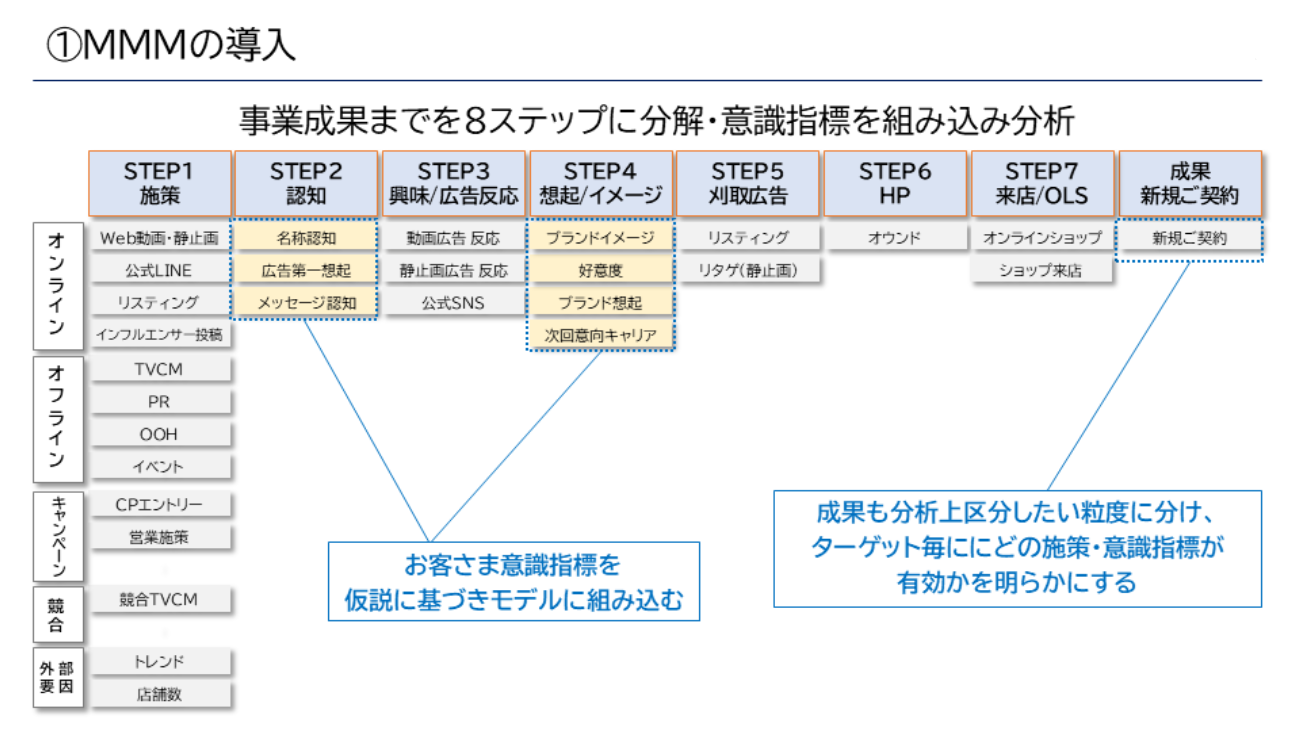 KDDIの取り組みの特徴は、一般的なMMMモデルにこの意識指標を組み込んでいる点だ。新規契約を最終ゴールとした際に、顧客の行動と意識を8ステップに分けて分析。途中のステップに「ブランドイメージ」や「好意度」といった意識指標を盛り込むことで、施策が意識に与えた影響が事業成果へどう貢献するかを明確化している。