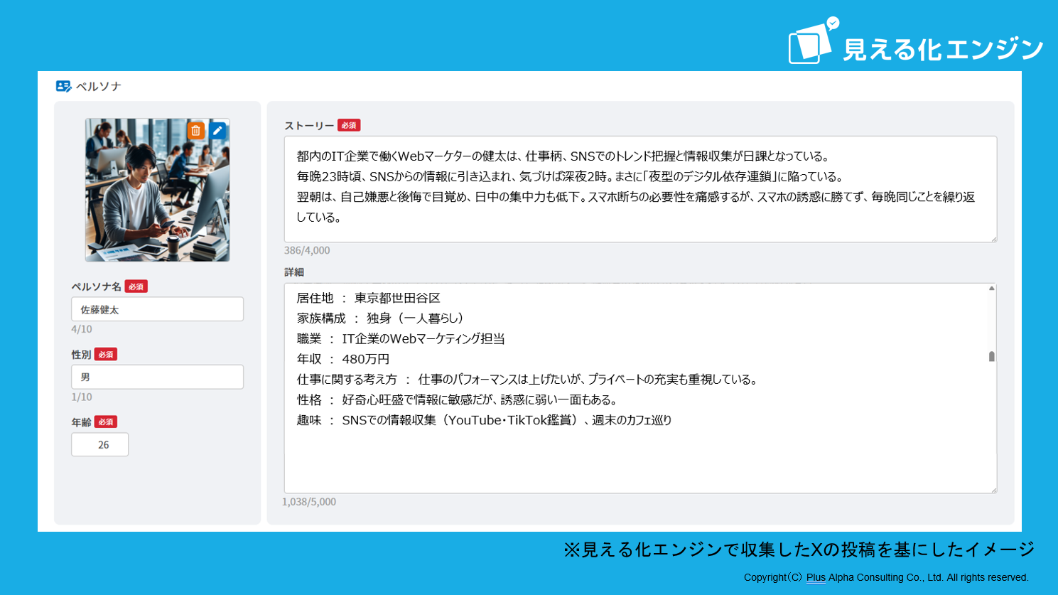 そこで、より深くそれらの人々を理解すべく、見える化エンジンの機能を用いてデジタル漬けになっている現代人の「AIペルソナ」を実際のXへ投稿された文章をもとに作成し、インタビューを実施。デジタルデトックスに失敗する要因、そして、その背景にあるインサイトについて深掘りした。