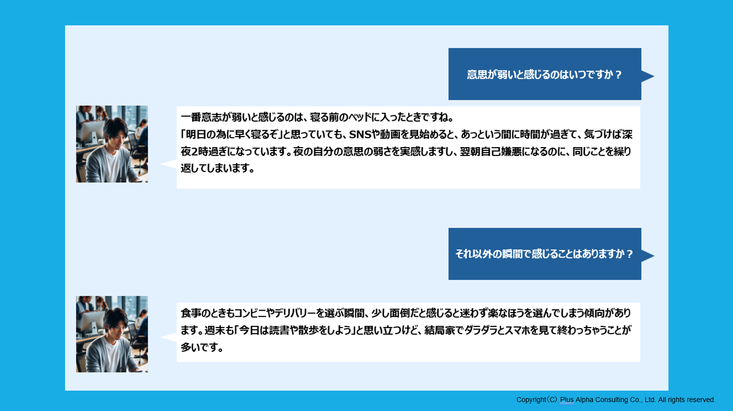 インタビュアー:なるほど、意思が弱いと感じる場面で共通していることは何ですか?