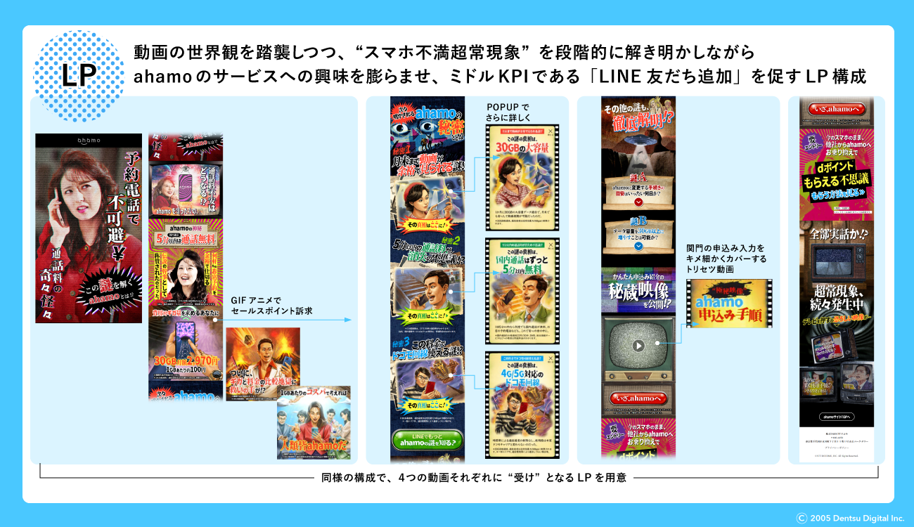 松村:スクロールを促進する仕掛けを組み込むとともに、4種の動画それぞれに合わせたLPを準備しました。スクロールしていくと「ahamoの謎」が解き明かされる構成にし、最後にLINE友だち追加へと自然に誘導できるよう工夫しています。