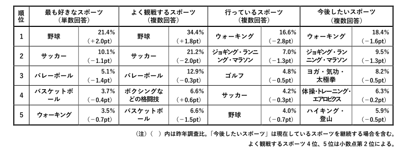 最も好きなスポーツは「野球」で、調査開始以来22年連続で首位となった。野球は上位のスポーツで唯一人気がさらに上昇した。