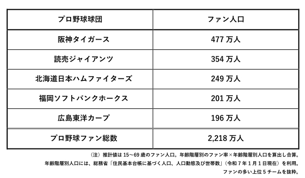 日本プロ野球のファン人口は前年比0.4%増の2,218万人で横ばいとなった一方、球団別では阪神タイガースが477万人と前年比14.9%増の大幅増となり、全球団中最多となった。他球団に比べ阪神ファンの増加が際立っており、今年の特徴的な現象といえる。