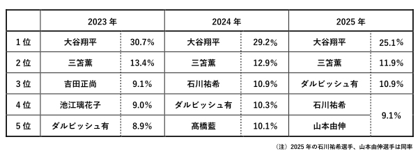 「好きなスポーツ選手」ランキングでは、大谷翔平選手が8年連続で1位となった。2位は三笘薫選手(3年連続)、3位にダルビッシュ有選手、4位に山本由伸選手と、海外で活躍する選手が上位を占めている。特に米メジャーリーグ所属選手の人気の高さは顕著だ。また、SNSを通じた情報発信やメディア露出の増加も選手人気を後押ししている可能性がある。