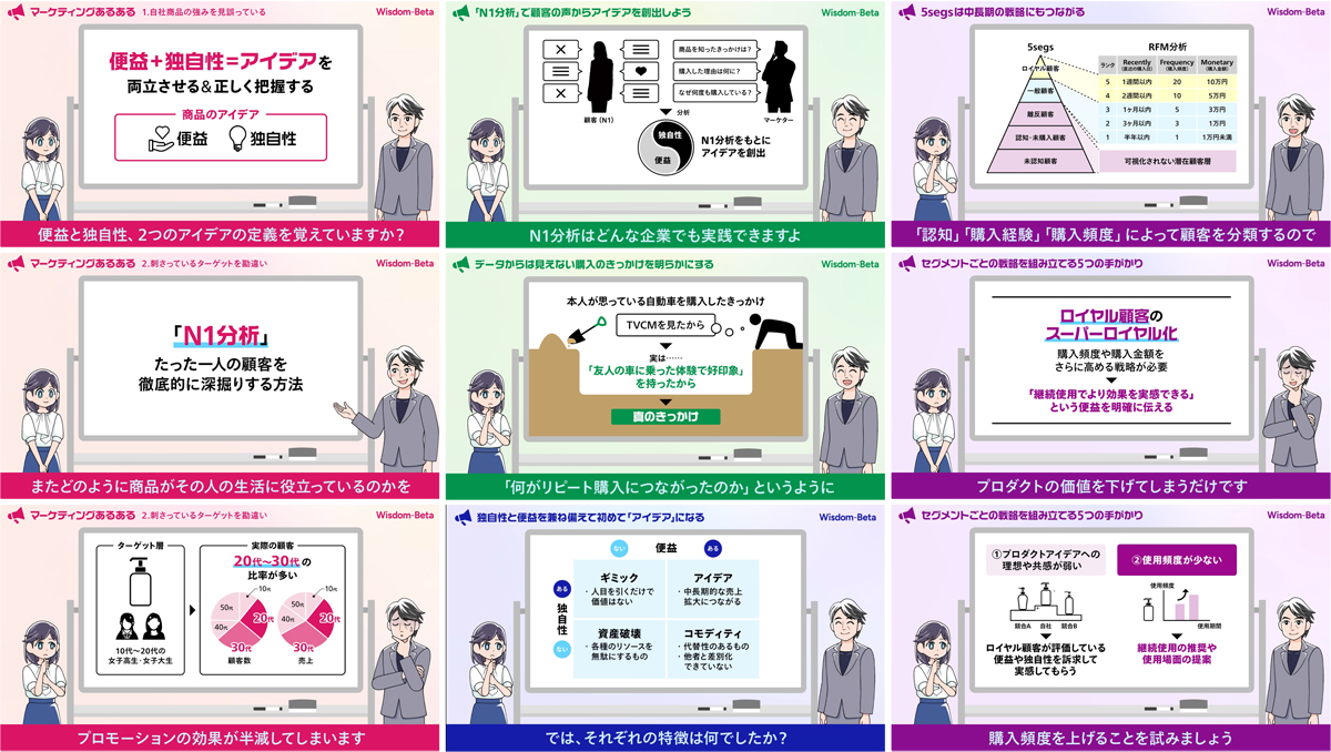 プログラムでは、「顧客起点」のビジネス推進理論を、アニメーションを用いたケーススタディで解説。顧客起点思考をストーリー形式で提供し、専門知識の有無にかかわらず幅広い社員への定着を支援する。N1分析や5segsなど再現性の高いフレームワークも多数紹介し、現場社員が顧客の本音やインサイトを把握して各部署間で共通認識として浸透させることを目指す。