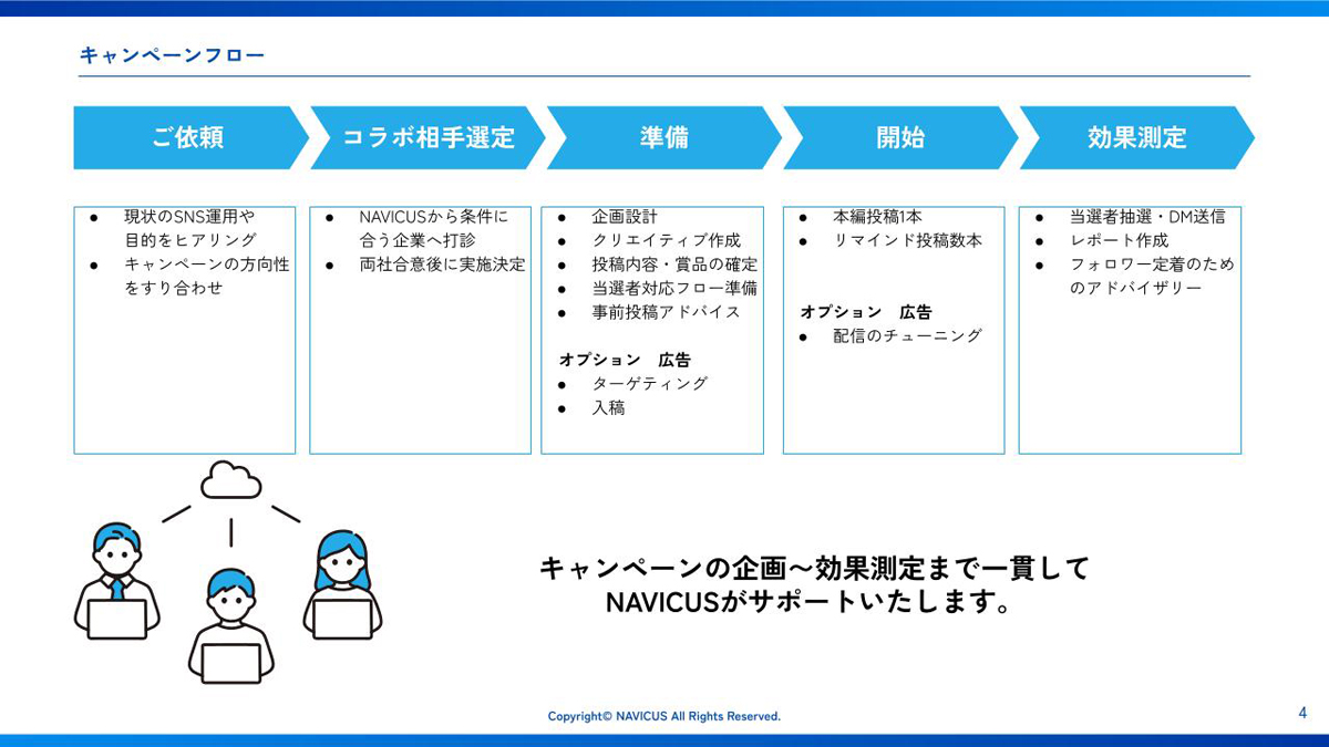 「SNSコラボキャンペーン」の基本料金は1回50万円(税抜)から。規模や目的により支援内容や価格が異なるため、詳細はNAVICUSへの問い合わせを求めている。